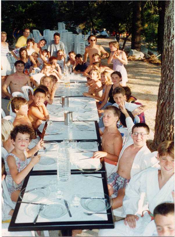 Hébergement sous la tente au camping *** Molinacciu. Traversée en ferry de Marseille à Ajaccio puis parcours en voitures particulières jusqu'au camping près de Porto Vecchio. Judo, gym et natation tous les jours. Tennis, tennis de table, planche à voile, pédalo, tir à l'arc avec des randonnées et des visites touristiques à Porto Vecchio et à Bonifaccio.